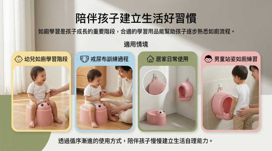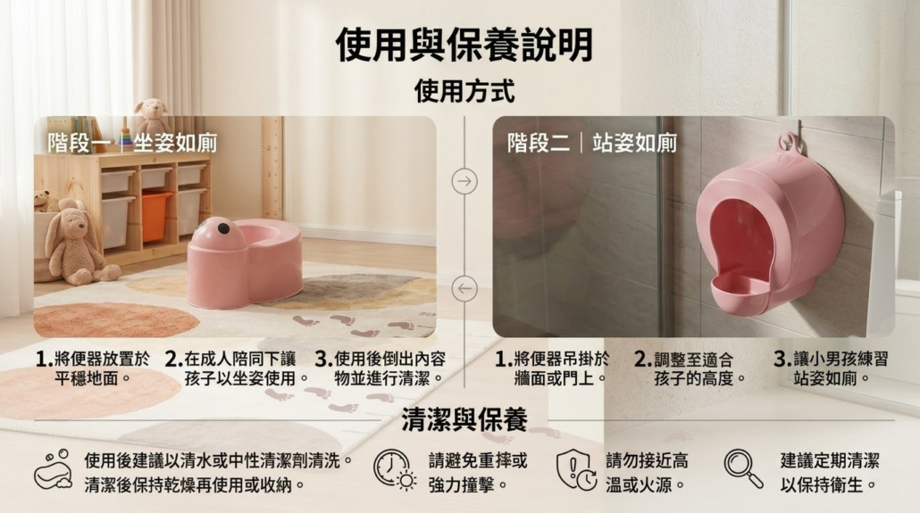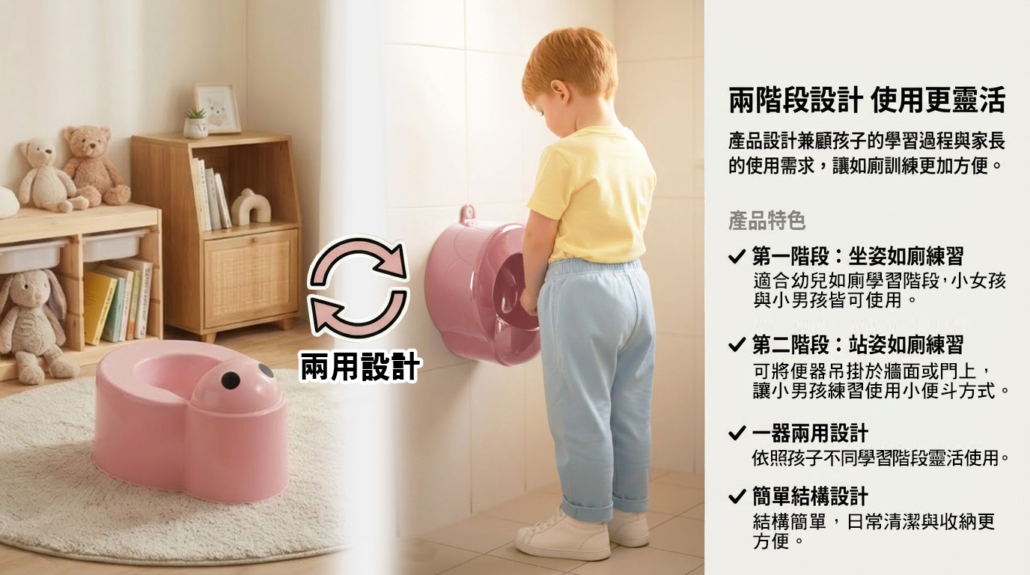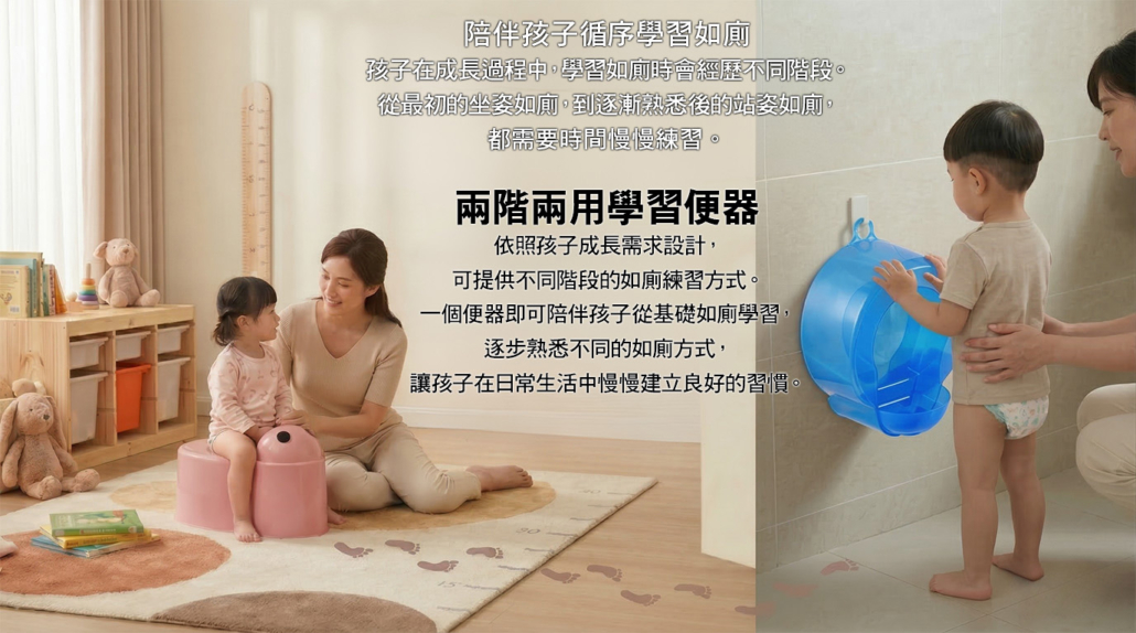 - 第二階段:訓練站姿如廁,將本便器吊掛於牆或門上,讓小男孩學習小便斗的使用方式。