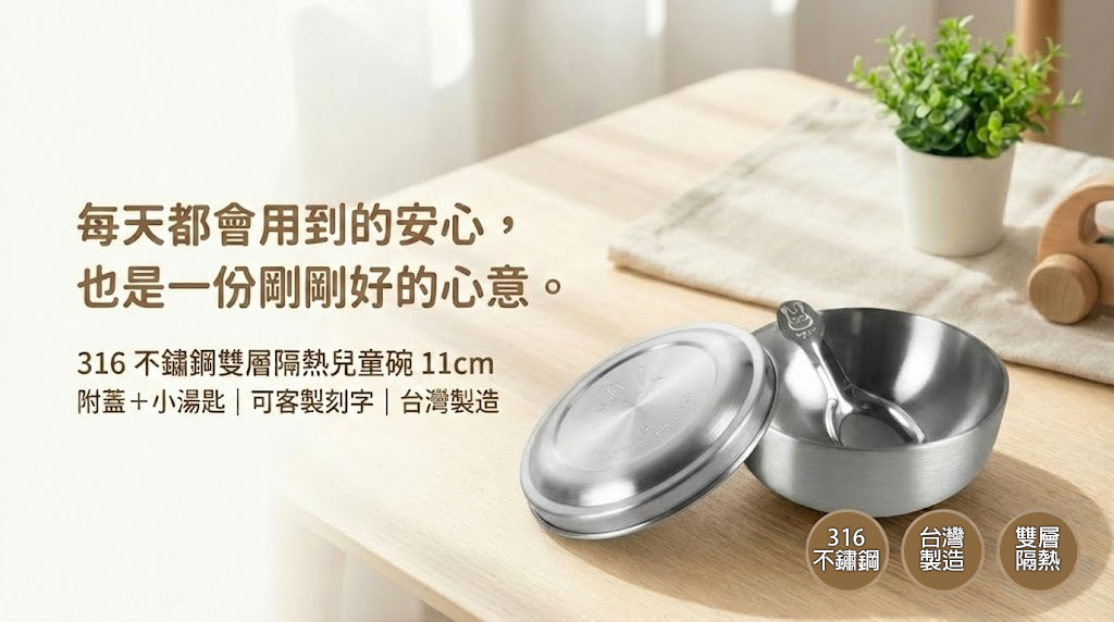 316不銹鋼雙層隔熱兒童碗11CM 附蓋+小湯匙(可客制刻字)